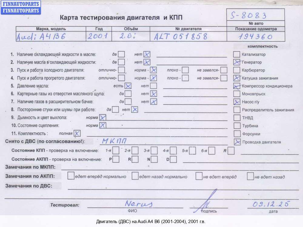 2003; Бензин; 2.0; ALT, Инжектор; Седан; ; серебристый; 2003, 2л, Бензин, Инжектор, ALT, ALT142080, Седан, серебристый, ALT142080 | - | Г | С | Н | Т | КК, прокручивается, состояние ГРМ - нормально, поддон - нормально, клапанная крышка - нормально, эмульсия - нет,